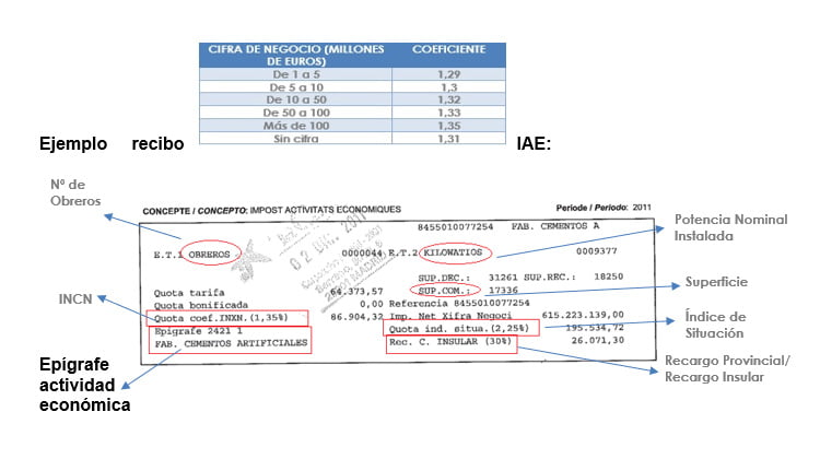 - Este impuesto local, que grava las actividades económicas realizadas en el ámbito municipal por las empresas, está regulado por el RD Legislativo 1175/1990. La cuota a pagar del IAE viene determinada por la actividad económica y por los coeficientes municipales, teniendo en cuenta, tal como puede verse en la siguiente gráfica, los siguientes conceptos: el nº de obreros; el Importe neto de la cifra de negocio (INCN); el epígrafe de actividad económica, del que existen más de 900 diferenciadas; la superficie afecta, que se pondera en función de la población; el índice de situación y el recargo provincial/recargo insular.