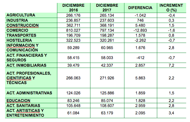 El resto de sectores sí cerró el año en positivo y en todos ellos se han producido nuevas altas de cotizantes al Régimen Especial de Trabajadores Autónomos (RETA), siendo las actividades inmobiliarias (+7,2% nuevos autónomos) el sector que porcentualmente ha crecido más. Le siguen en crecimiento relativo las actividades artísticas (+3,4%) y las actividades relacionadas con la salud y la comunicación (+2,8%). En números absolutos destaca el crecimiento anual de los autónomos dedicados a las actividades profesionales, científicas y técnicas (+5.863 autónomos) y construcción (+5.480 autónomos).