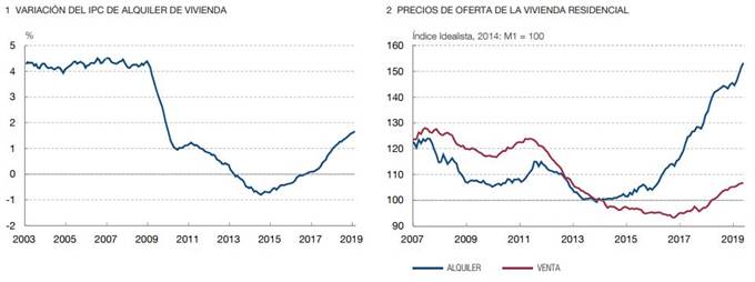 Este incremento de la demanda ha ido, consecuentemente, acompañado de un aumento en los coste de los alquileres. Siguiendo con el informe del BdE, “los precios de oferta del alquiler residencial en el conjunto de España han mostrado un notable dinamismo desde su mínimo a finales de 2013”, con crecimientos acumulados hasta mediados de 2019 en el entorno del 50%.