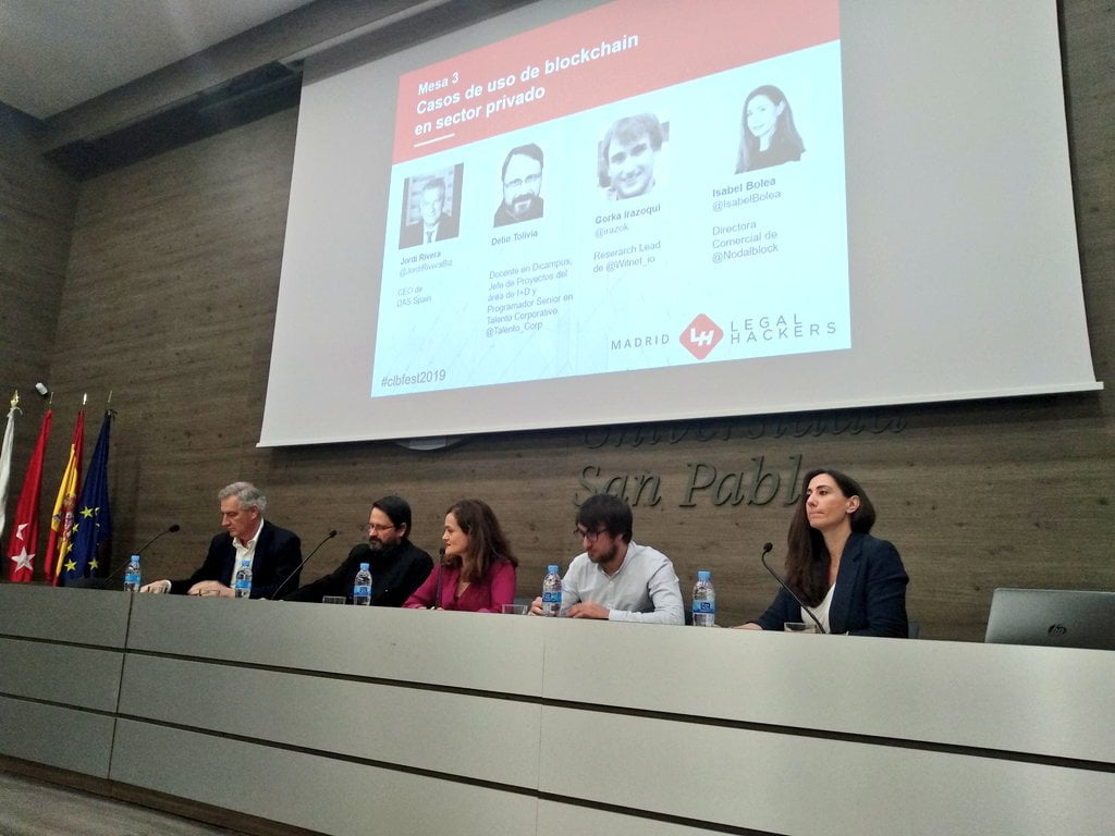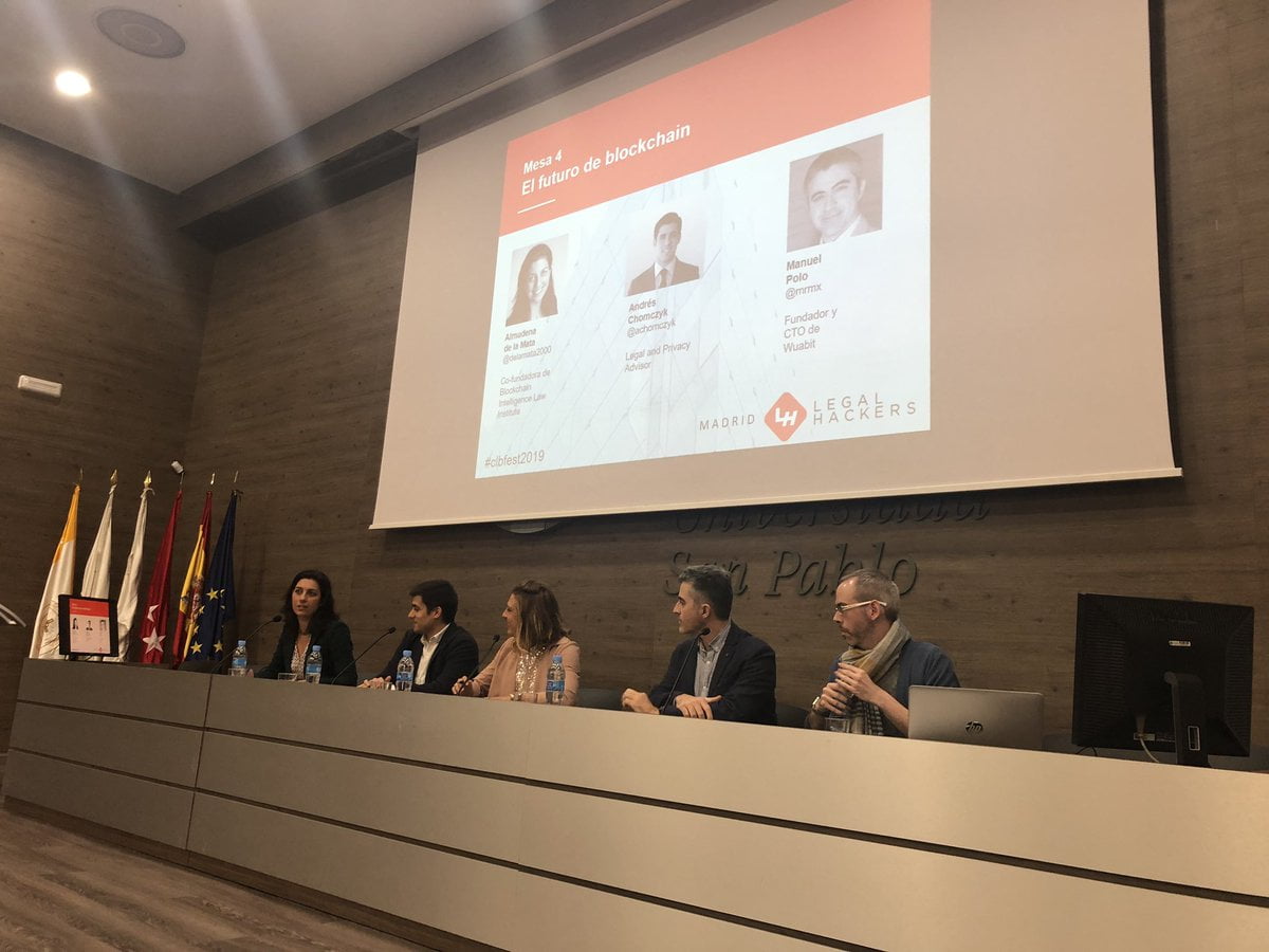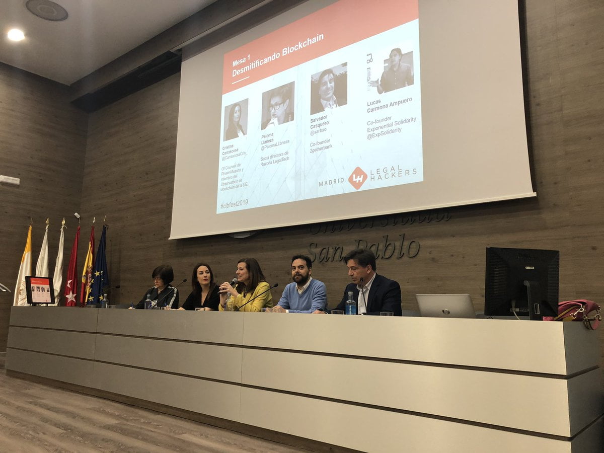 En la primera de ellas, participaron Cristina Carrascosa (Of Counsel Pinset-Masons, miembro del Observatorio de Blockchain de la UE), Paloma Llaneza (Socia directora Razona LegalTech y escritora), Salvador Casquero (Co-founder de 2getherbank) y Lucas Carmona Ampuero (Co-founder Exponential Solidarity), moderados por Cristina Martínez Laburta (coorganizadora de Legal Hackers). La mesa tuvo como objetivo despojar la tecnología de la moda existente para entender sus verdaderos atributos, ventajas y peligros. Mientras Paloma Llaneza insistió en que los valores de descentralización, consenso y confianza que se atribuyen a Blockchain no eran nuevos, y también en que la tecnología Blockchain corría el peligro de no sobrevivir a la era cuántica, Cristina Carrascosa también destacó la necesidad de un buen sistema de consenso y de realizar un gran ejercicio de transparencia en el uso de Blockchain.