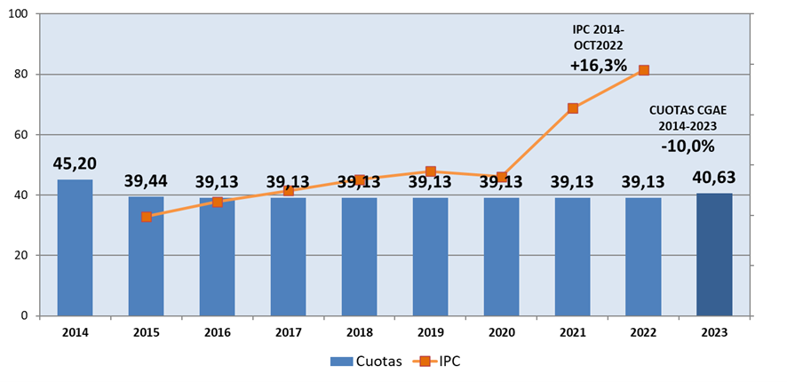 Esta fuerte disminución en el número de aportaciones, así como el relevante alza del IPC, ha obligado al Consejo de la Abogacía a aprobar un incremento de la aportación anual de 1,5 euros. Así, la cuota del Consejo para 2023 será de 40,63 euros, casi 5 euros por debajo de los 45,20 euros que se pagaban en el año 2014 (ver gráfico).