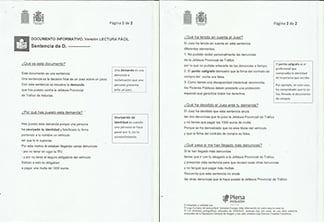 En resumen nos hallamos ante una resolución judicial (habitualmente Sentencia) que se encuentra dirigida a un justiciable con sus capacidades cognitivas mermadas; a un incapacitado judicialmente o a un discapaz (todos ellos sujetos de Derecho), donde por una parte se resume el contenido de la resolución y por otra, se procede a una redacción que contenga términos sencillos y comprensibles que evite el uso de tecnicismos, facilitando así la comprensión al justiciable no especialista en Derecho. La situación es extrapolable a cualquier persona que, aun sin limitaciones cognitivas, carezca de conocimientos en Derecho.