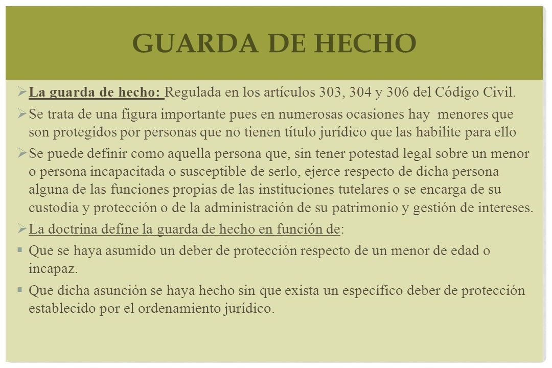 [vii] La guarda de hecho es una situación jurídica en la que un sujeto, sin contar con nombramiento judicial para ello, se encarga de la guarda de alguien en quien concurren posibles causas de incapacitación.