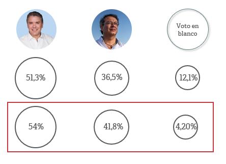 Duque es de 2,65 %, de Gustavo Petro es de 5,33 % y de voto en blanco es de 7,9 %. Sin embargo, sorprende la diferencia de los resultados entre las firmas encuestadoras, pues la mayor distancia de porcentaje de intención de voto entre los dos candidatos fue del 20 % (Firma CNC) y la menor fue del de 6 % (Firma Datexco). La más acertada fue Cifras y Conceptos que pronosticó 8,9 % ante una distancia real del 12,12 % entre los dos candidatos. Esta disparidad de datos se puede presentar debido al fenómeno del voto vergonzante e indefinido, el cual no permite que los sondeos reflejen o se acerquen a los resultados por separado, pero haciendo un promedio se evidencia una tendencia similar.