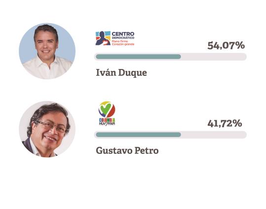 Este domingo 17 de junio se llevó a cabo la segunda vuelta de las elecciones presidenciales en Colombia. Con el 99,68 % de las mesas informadas la participación disminuyó un 1 % con relación a los votantes que acudieron a las urnas en primera vuelta el pasado 27 de mayo y el voto en blanco, aunque prometía sorprender y aumentó en un 58 % con respecto a la primera vuelta, no superó el 5 %. Aun así, obtuvo su mayor tasa en la historia de Colombia con una cifra del 4,2 %. Los resultados dieron como ganador al candidato por el Centro Democrático, Iván Duque con 54,07 % frente al 41,72 % que obtuvo su contendor Gustavo Petro.