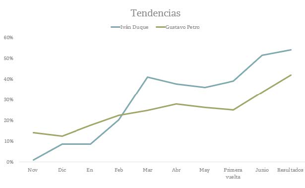 Esta gráfica muestra la evolución de los candidatos en las encuestas, las votaciones de la primera vuelta y el resultado final. Las tendencias muestran una curva de crecimiento parecida desde abril, mes en el que ambos empezaron a bajar por el fortalecimiento de otras opciones, sobre todo de Sergio Fajardo. El promedio de las encuestas, reflejó el crecimiento de ambos candidatos e incluso el del voto en blanco a partir del mes de mayo, resultado que se esperaba, teniendo en cuenta que ya eran solo dos las opciones de voto.