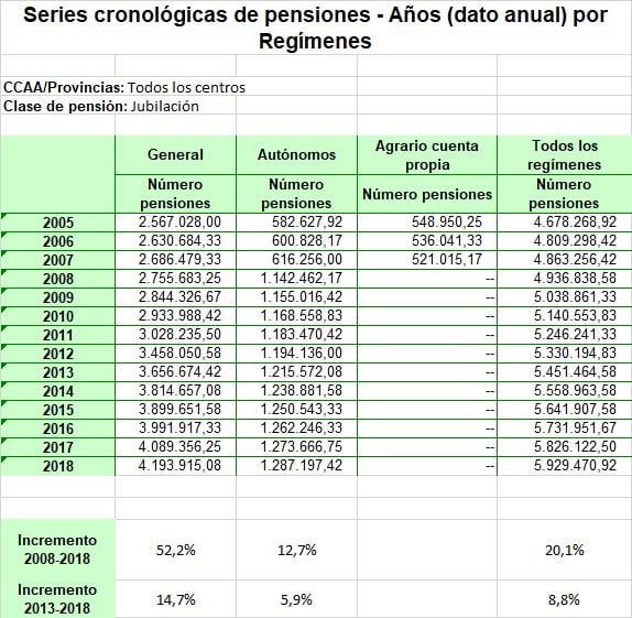 En el mismo periodo el incremento de pensionistas (ver tabla 4) pone de manifiesto cómo la jubilación activa ha hecho que este incremento en los últimos 5 años haya sido menos de la mitad (un 5,9%) que en los asalariados en los últimos 5 años (14,7%).