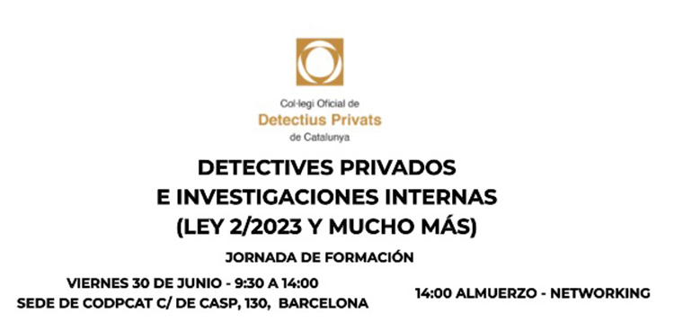 El próximo viernes 30 de junio, el Col·legi Oficial de Detectius Privats de Catalunya celebrará una jornada de formación centrada en las investigaciones internas y, en especial, en los aspectos de la ley 2/2023, reguladora de la protección de las personas que informen sobre infracciones normativas y de lucha contra la corrupción, que afectan a los detectives privados.