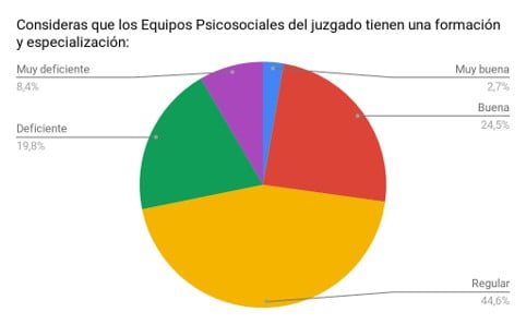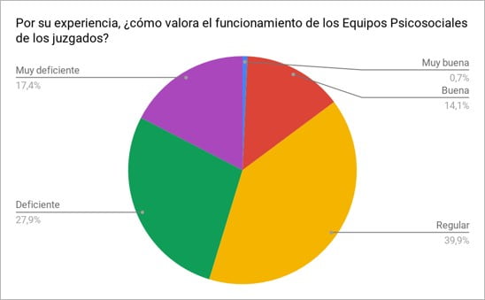 La valoración de la abogacía especializada sobre el funcionamiento de los equipos psicosociales es muy negativa. El 45% de los encuestados califica su actividad de deficiente o muy deficiente, un 40% de regular y solo un 15% manifiesta estar satisfecho con su labor. El informe de AEAFA señala varios aspectos deficitarios en esa práctica forense:
