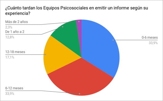 En cuanto a los plazos de emisión de los informes por parte de los equipos psicosociales, la encuesta efectuada a través del Observatorio de Derecho de Familia revela que en el 60% de los casos la demora supera los seis meses, pudiendo tardar un año o más en tres de cada diez peritajes. Solamente el 34% de las evaluaciones se realizaría dentro de un plazo de seis meses.