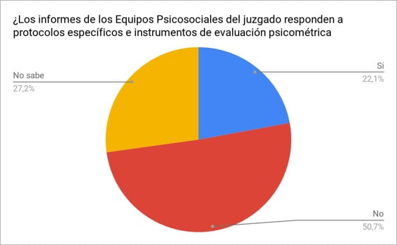 La encuesta de AEAFA entre la abogacía especializada también pone de manifiesto que la actuación de estos equipos se desarrolla sin protocolos específicos e instrumentos de evaluación psicométrica apropiados para examinar a los integrantes de una familia. Así lo opina el 51% de los encuestados.