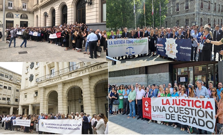 De A Coruña hasta Santa Cruz de Tenerife, pasando, entre otros muchos sitios, por Oviedo, Ceuta, Lorca, Valencia, Algeciras, Sevilla, Valladolid o Bilbao, vestidos de toga en muchos casos, miles de abogados y abogadas se han concentrado a mediodía ante las principales sedes judiciales de su provincia exigiendo una solución que les permita normalizar su actividad profesional y dar con ello respuesta al derecho de la ciudadanía a obtener de los poderes públicos una tutela judicial efectiva.