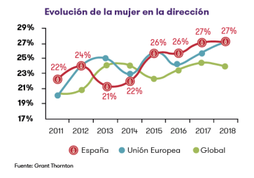 Por segundo año consecutivo, el porcentaje de directivas en las empresas españolas se sitúa en el 27%, la misma cifra que hace un año. Aunque nos situamos por encima de la media global (24%) y en el mismo rango que la Unión Europea (27%), el avance del liderazgo femenino se ha frenado en España.
