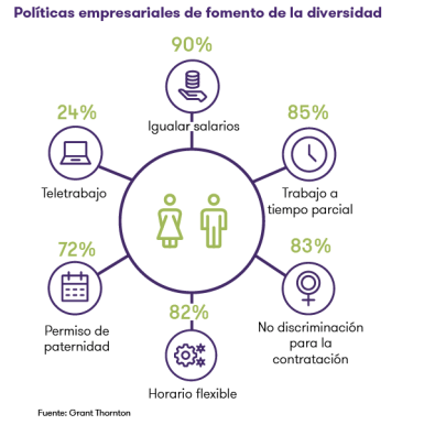 Para encontrar respuesta al estancamiento, el informe de Grant Thornton analiza qué han hecho las empresas españolas y las instituciones para impulsar el cambio en el último año. Los datos muestran que las políticas de igualdad de género son abundantes y su uso está generalizado; el 90% de empresas en España cuentan con políticas de igualdad salarial para hombres y mujeres que desempeñan las mismas funciones; el 85% tiene establecidas modalidades de trabajo a tiempo parcial y el 83% aplica políticas de no discriminación a la hora de contratar. Las medidas de apoyo a los padres que trabajan también muestran una buena acogida en las compañías del país, principalmente horarios flexibles (82%) y permisos de paternidad retribuidos.