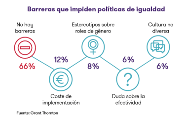 Nuestras empresas tampoco consideran que haya barreras a la hora de implantar medidas de equilibrio de género en sus plantillas. Así lo considera 7 de cada 10 empresarios españoles. Y si las hay, son principalmente el coste que conlleva implementarlas, los estereotipos sobre los roles de género y las dudas reales sobre su efectividad.