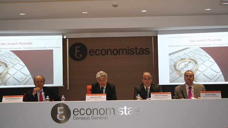 (de izda. a dcha.): José Mª Raventós (coordinador del encuentro organizado por el Consejo General de Economistas de España), Valentín Pich (presidente del Consejo General de Economistas de España), Javier Fonseca (director de Tecnología y Operaciones de Global Corporate Banking del Banco Santander) y Antón Gasol (economista experto en entidades financieras).