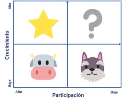 Ello se corresponde a lo conocido en el mundo del Marketing como matriz BCG, en la que se relacionan el crecimiento y la participación en el mercado (o cuota de mercado). Nos entramos en ella con cuatro elementos que componen los cuatro cuadrantes de la matriz: