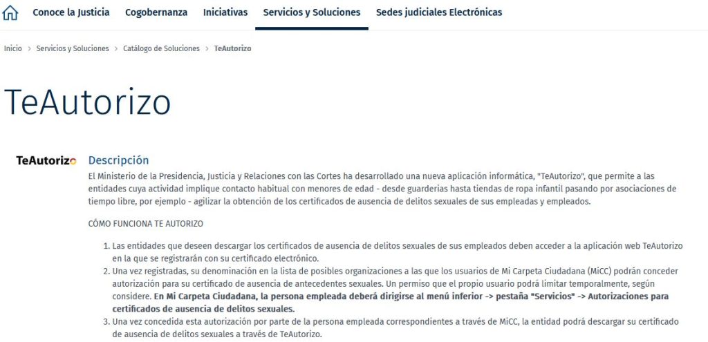 El Ministerio de la Presidencia, Justicia y Relaciones con las Cortes, en colaboración con el Ministerio para la Transformación Digital y de la Función Pública, ha desarrollado TeAutorizo, una nueva aplicación web que permitirá a empresas y particulares agilizar la obtención de certificados de ausencia de delitos sexuales y trata de seres humanos, que contribuirá a aumentar la protección del menor así como a mejorar los servicios a la ciudadanía, eliminando cargas administrativas tanto para las empresas como para las personas.